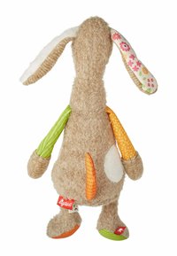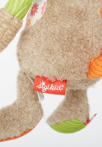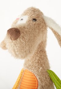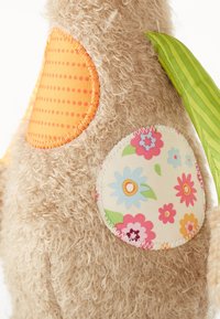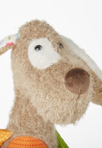 Jouet en peluche en forme de chien avec un corps beige texturé, des oreilles à motifs colorés et des accents à pois en orange, vert et rose. Possède des membres en peluche et mous.