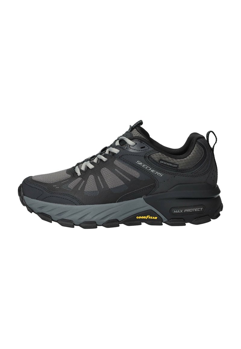 Chaussure de sport Skechers gris foncé et noir avec des lacets gris, une semelle Goodyear et un amorti "Max Protect" visible sur le côté.