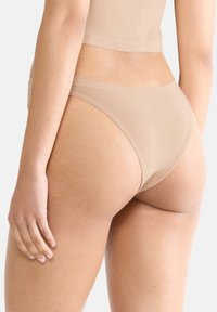 Femme portant des sous-vêtements beiges seamless à taille haute et un haut court assorti, se tenant devant un fond blanc uni.