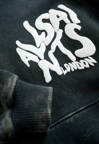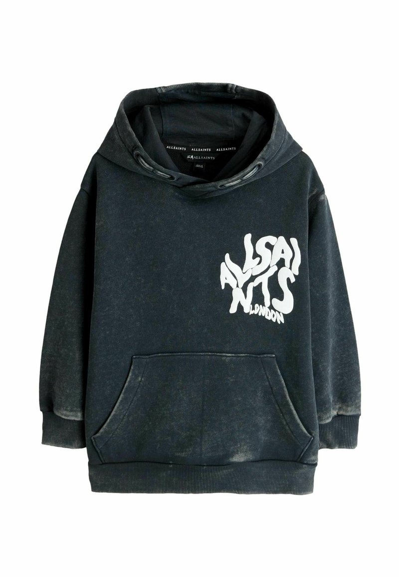 Sweat à capuche noir délavé avec poche avant et logo blanc déformé "ALLSAINTS LONDON" sur la poitrine, doté d'une capuche avec cordon de serrage et de poignets côtelés.
