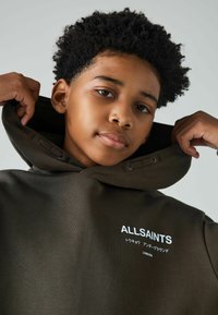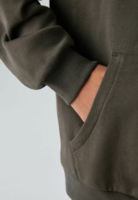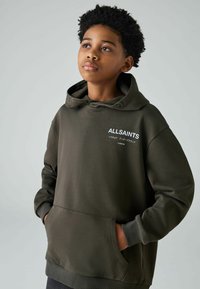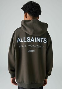 Hoodie vert olive avec un grand logo en texte blanc au dos, avec du texte supplémentaire en japonais et "LONDON" en bas. Texture douce.