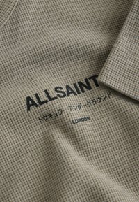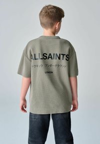 Gros plan d'une personne portant une chemise texturée vert olive avec l'inscription "ALLSAINTS" et des caractères japonais imprimés sur la poitrine.