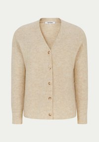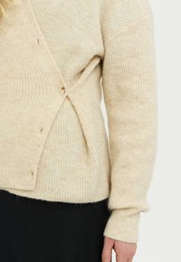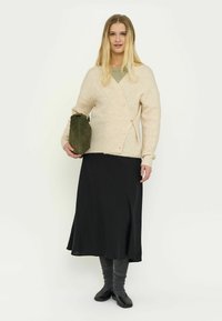 Cardigan beige clair avec un col en V, texture côtelée et cinq boutons sur le devant. Porté sur une chemise verte et associé à une jupe noire.
