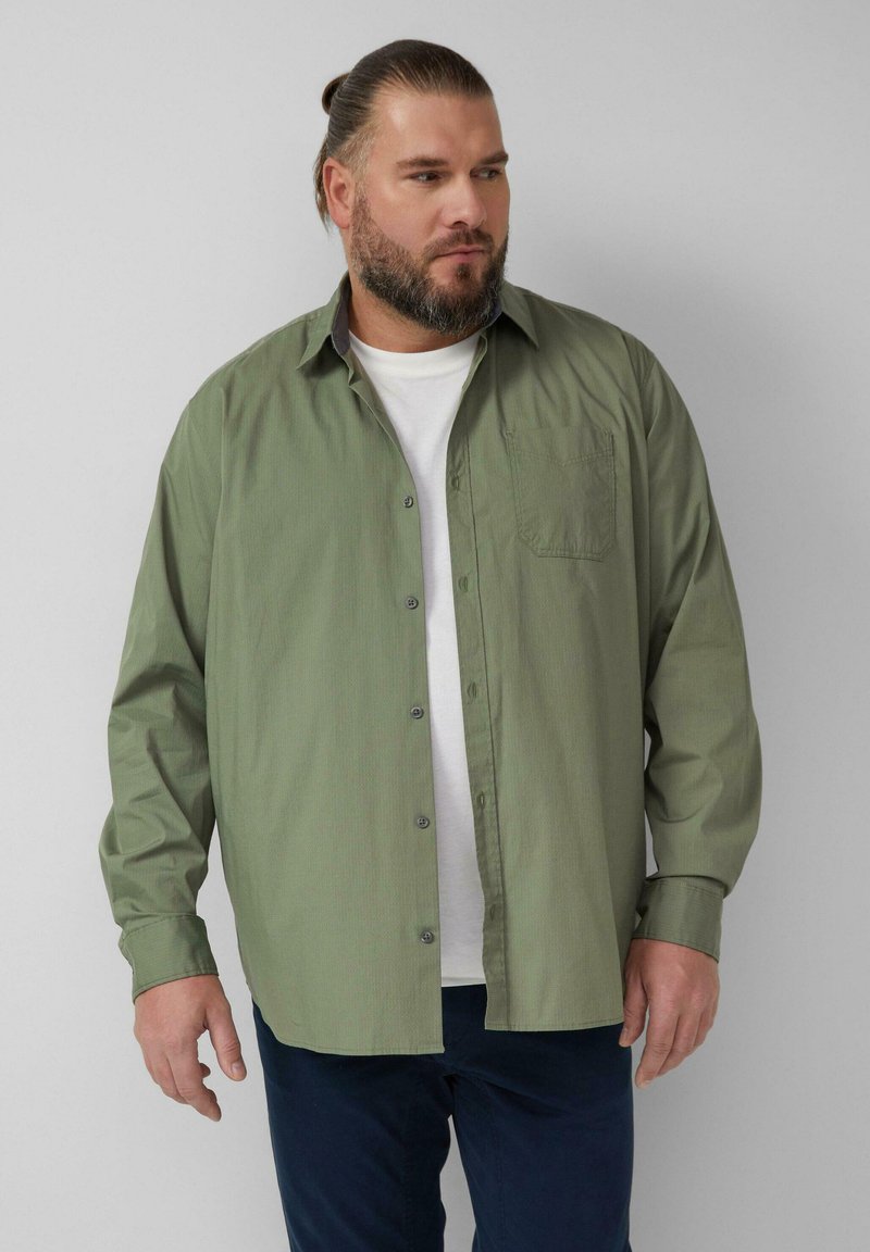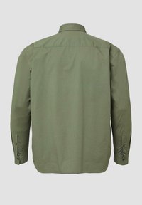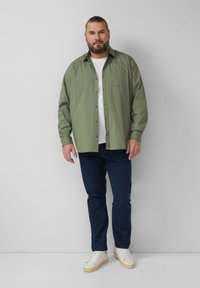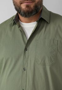 Homme avec une barbe et les cheveux attachés, portant une chemise vert olive déboutonnée par-dessus un t-shirt blanc et un pantalon sombre, regardant légèrement vers la droite.