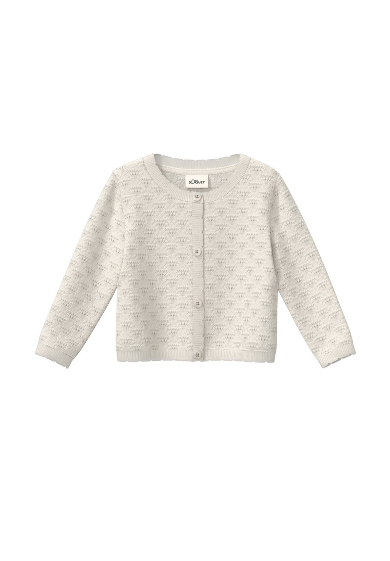Cardigan en tricot couleur crème pour bébé, à manches longues, col rond, boutons sur le devant, et motif texturé subtil.