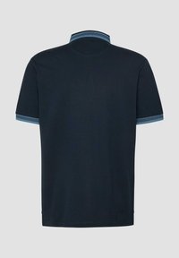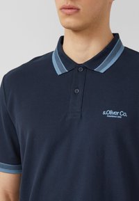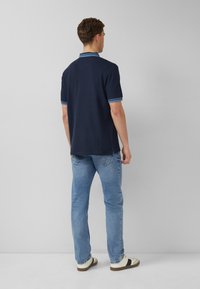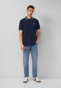 Jeune homme aux cheveux courts et bouclés, portant un polo bleu marine avec des bordures bleu clair et un jean bleu clair, debout devant un fond uni.
