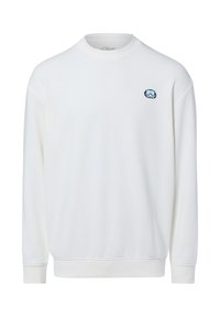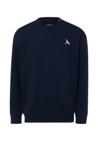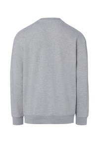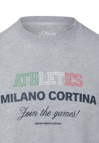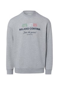 Sweat-shirt gris en mélange de coton, avec col rond, poignets et ourlet côtelés. Texte graphique sur le devant en rouge, vert et bleu marine.