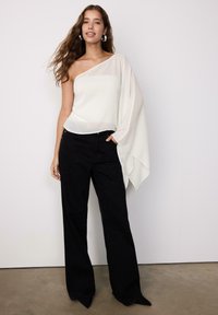 Jeune femme aux longs cheveux portant un top blanc à une épaule avec une manche fluide et un pantalon noir, les mains dans les poches, debout devant un fond neutre.