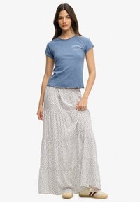 Jeune femme portant un t-shirt bleu SuperDry aux manches retroussées et une jupe blanche à motifs floraux bleus.