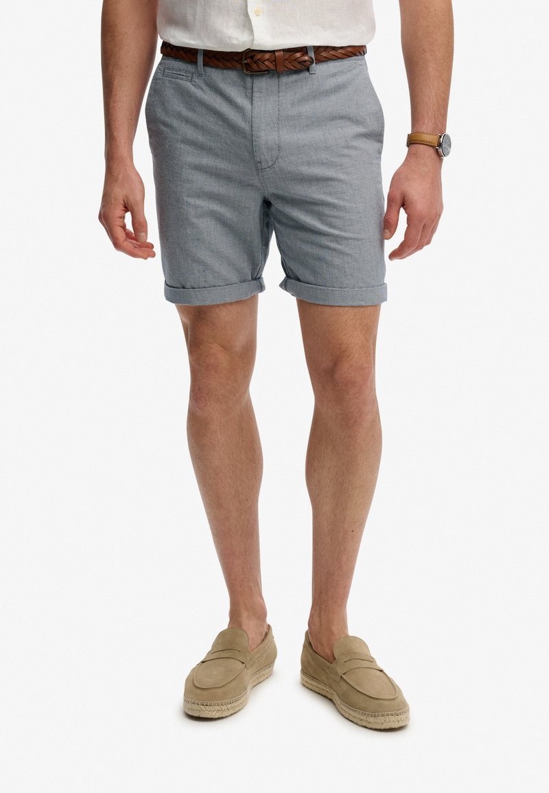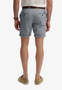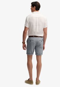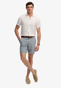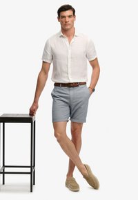 Homme portant un short bleu clair retroussé, une chemise blanche, une ceinture tressée marron, des mocassins beige et une montre-bracelet sur un fond blanc.