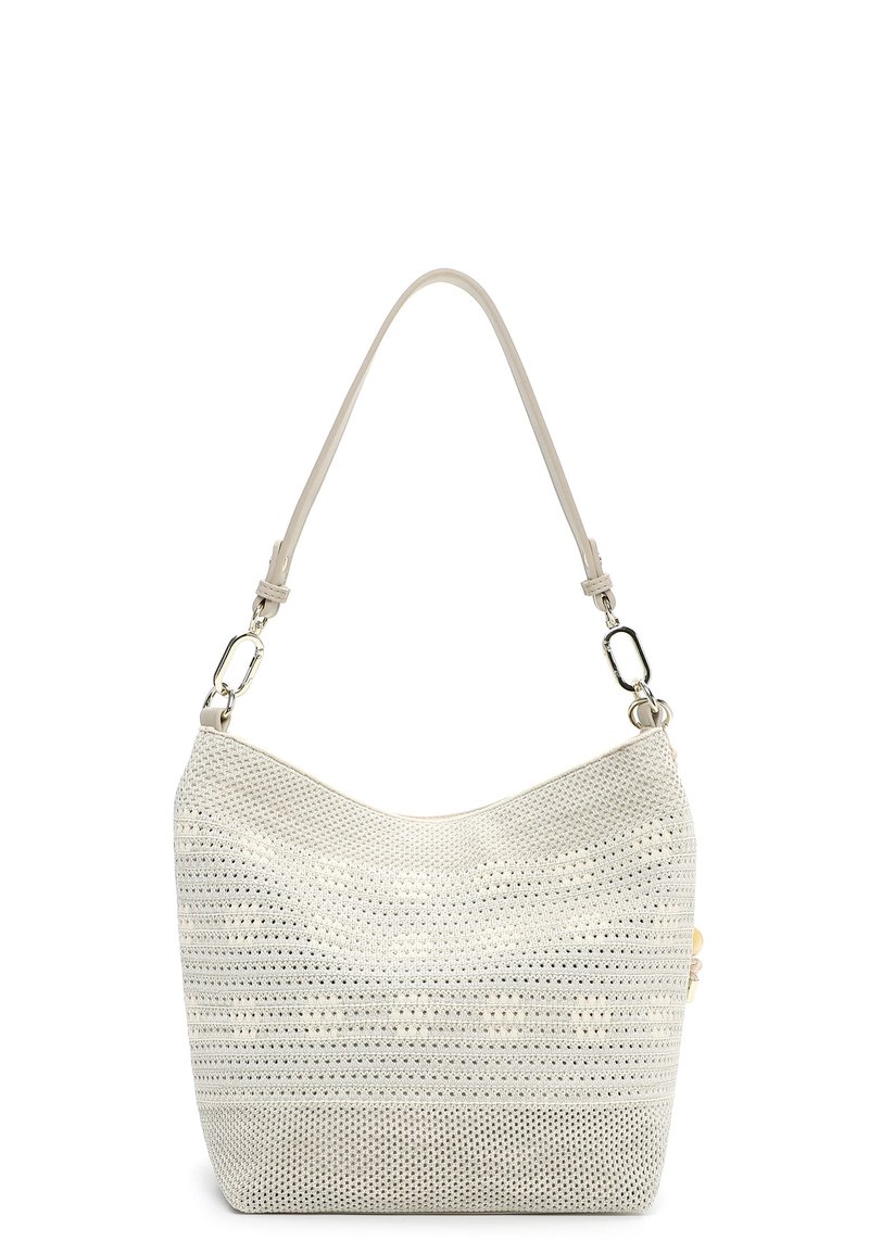 Sac à épaule en cuir tressé blanc avec une bandoulière simple et des fermoirs métalliques argentés, forme seau avec bord supérieur légèrement incurvé.