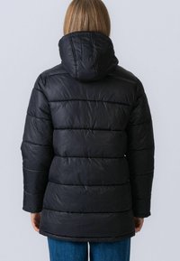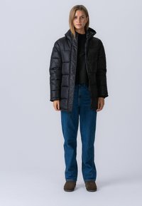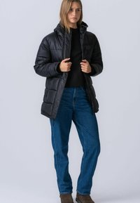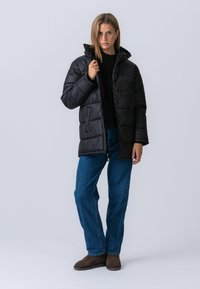 Femme portant une doudoune noire à col montant, fermeture éclair sur le devant, les mains reposant sur les côtés, debout devant un fond neutre.