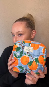 Petit pochon matelassé avec fermeture éclair, décoré d'un motif d'oranges et de feuilles vertes sur un fond bleu clair, portant l'étiquette "The Flat Lay Co."
