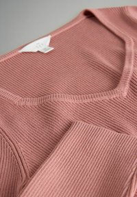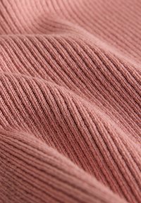 Trois pulls à manches longues côtelés empilés, couleurs rose clair, vieux rose et brun foncé avec encolures carrée et en V.