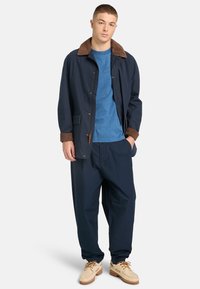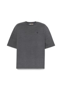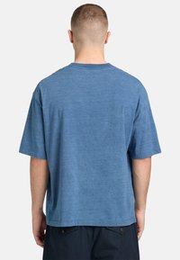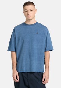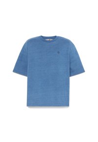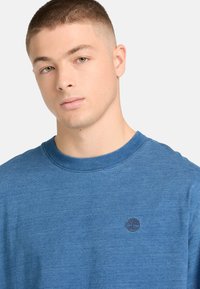 T-shirt bleu à manches courtes en tissu texturé, avec un col rond et un petit logo sur la poitrine. Coupe décontractée.