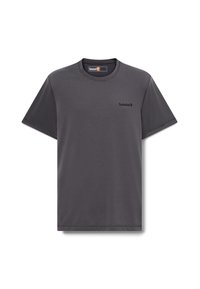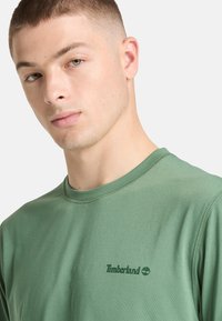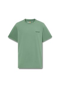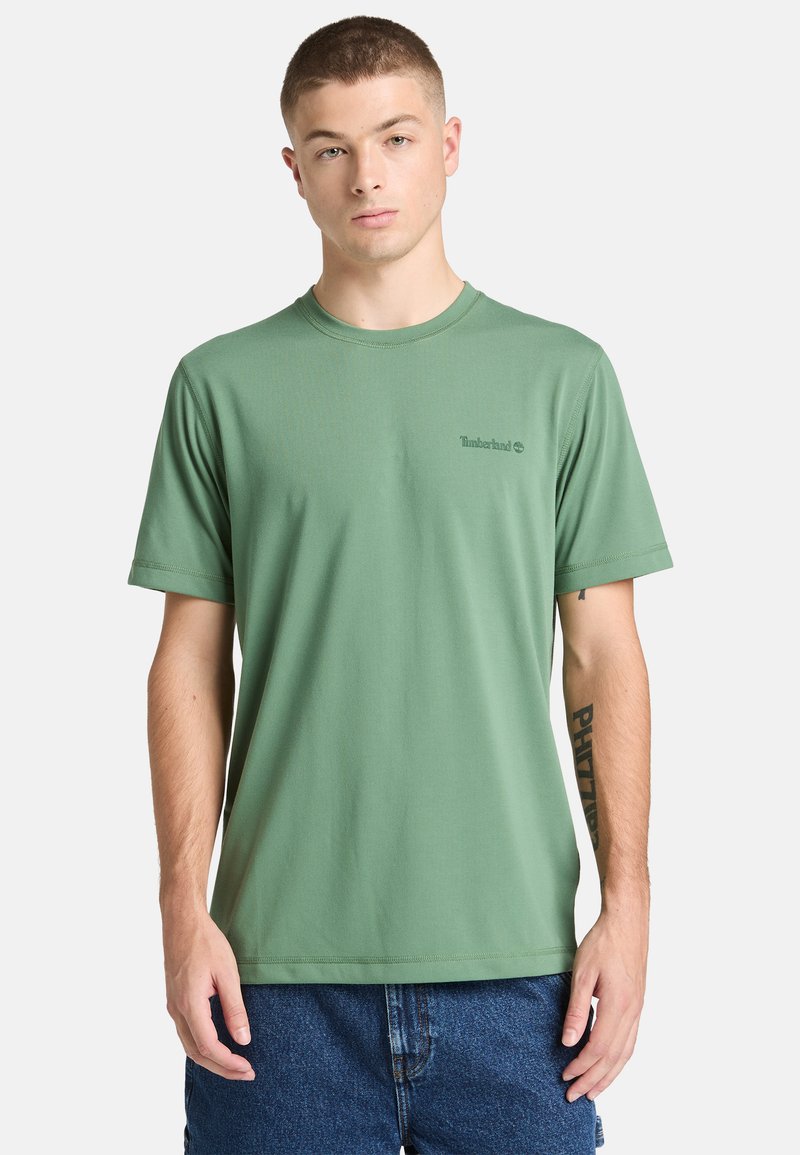 T-shirt vert à manches courtes en tissu lisse, avec un col rond et un logo Timberland discret sur la poitrine.