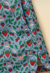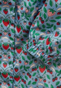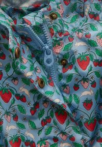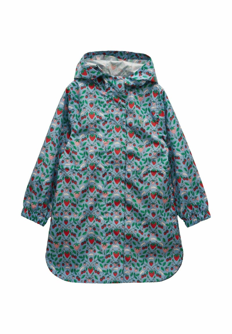 Imperméable à capuche pour enfant avec fond bleu et motif coloré de fraises et de feuilles, poignets élastiques et fermeture avant par boutons.