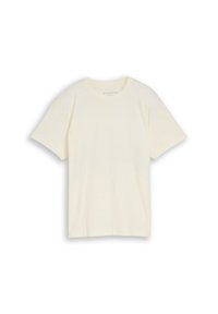 T-shirt à manches courtes et col rond de couleur blanc cassé, posé à plat avec l'étiquette de la marque visible à l'intérieur du col.