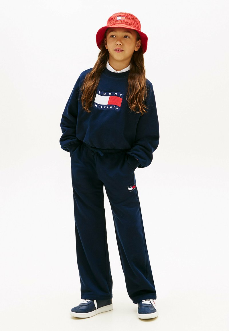 Enfant portant un sweat-shirt et un pantalon Tommy Hilfiger bleu marine, un chapeau seau rouge, et des baskets bleues, debout les mains dans les poches.