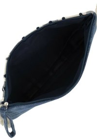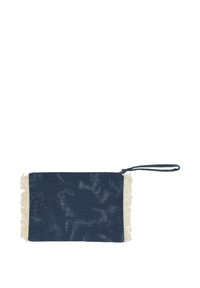 Pochette en tissu rectangulaire avec des rayures verticales noires et grises, bords à franges et une sangle noire pour poignet sur un fond blanc.