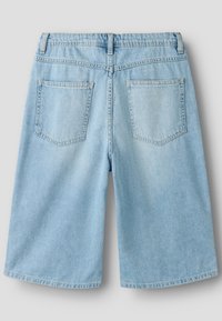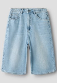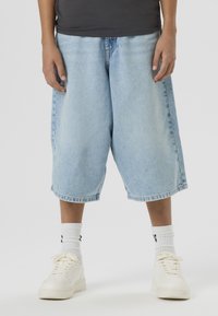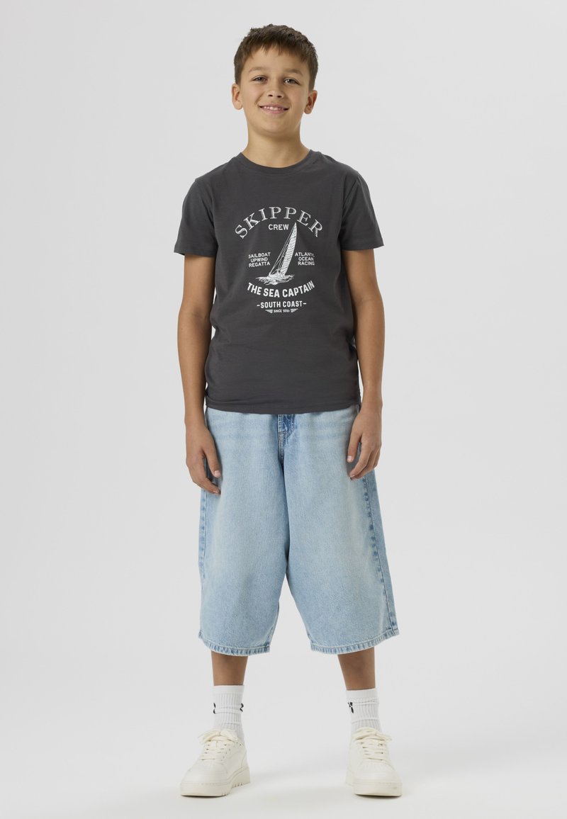 Garçon debout et souriant, portant un t-shirt gris foncé "Skipper", un short en jean large bleu clair, des chaussettes blanches et des baskets blanches.