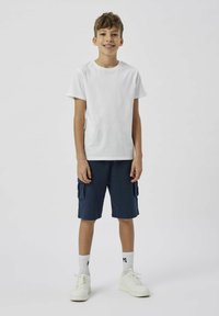Garçon souriant debout portant un t-shirt blanc, un short cargo bleu marine, des chaussettes blanches et des baskets blanches sur un fond clair uni.