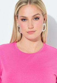 Femme aux cheveux blonds raides portant un t-shirt à manches courtes rose vif et un pantalon rouge avec de grands motifs abstraits roses et blancs, faisant face à l'avant.