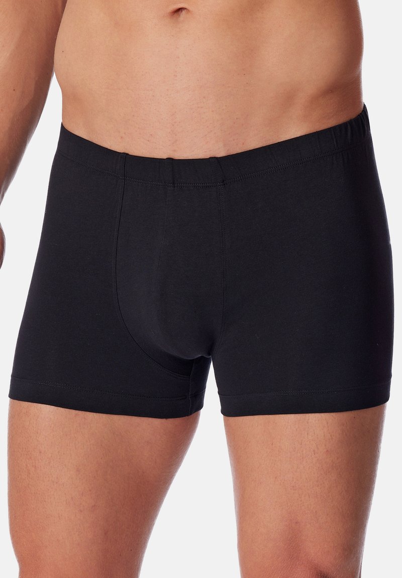Caleçons boxer noirs en coton avec une taille élastique et une texture lisse, dotés d'une poche avant et d'une jambe courte.