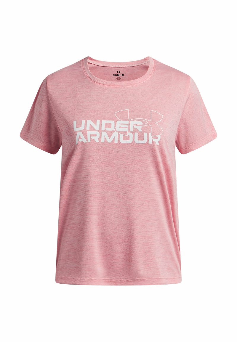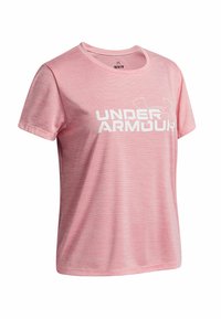 T-shirt rose à manches courtes en tissu léger, avec un logo blanc "UNDER ARMOUR" sur le devant et un col rond.