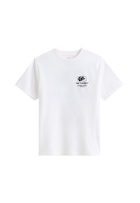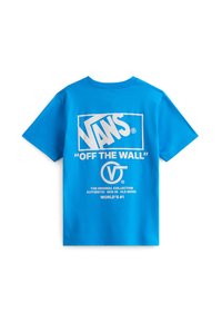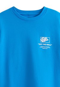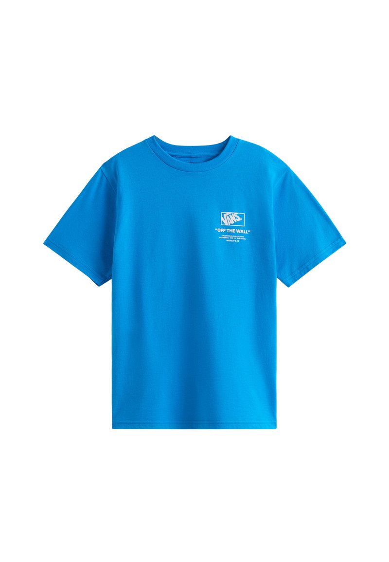T-shirt bleu vif à manches courtes avec un petit logo Vans blanc et le texte "Off The Wall" sur la partie gauche de la poitrine.