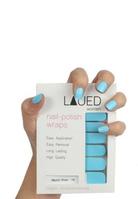 Wraps pour ongles LAUED pour femmes en bleu, étiquetés Mystic River - 16, avec les caractéristiques suivantes : application facile, retrait simple, longue tenue, haute qualité, véganes, sans tests sur les animaux.