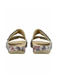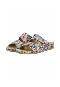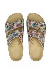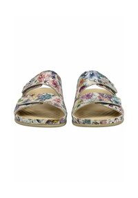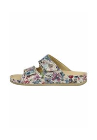Sandale à enfiler avec deux sangles réglables, semelle beige, et motif floral multicolore couvrant toute la chaussure.