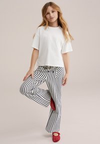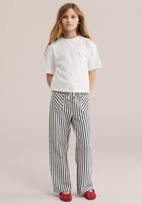 Jeune fille debout, portant un t-shirt blanc uni, un pantalon rayé vertical noir et blanc avec des poches avant, et des chaussures rouges tissées sans lacets.
