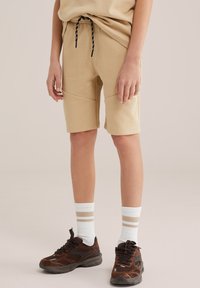 Enfant aux cheveux bouclés mi-longs portant un t-shirt beige et un short, des chaussettes blanches et des baskets marron, debout les mains dans les poches.