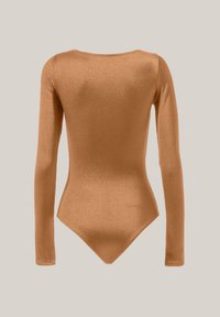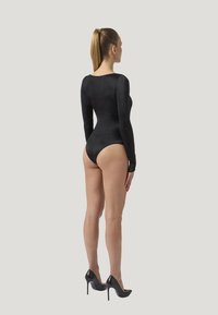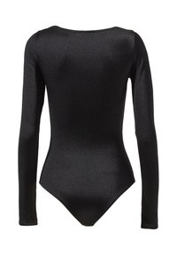 Body noir à manches longues en matériau brillant ; doté d'un col arrondi et d'une coupe ajustée avec une découpe haute au niveau des jambes.